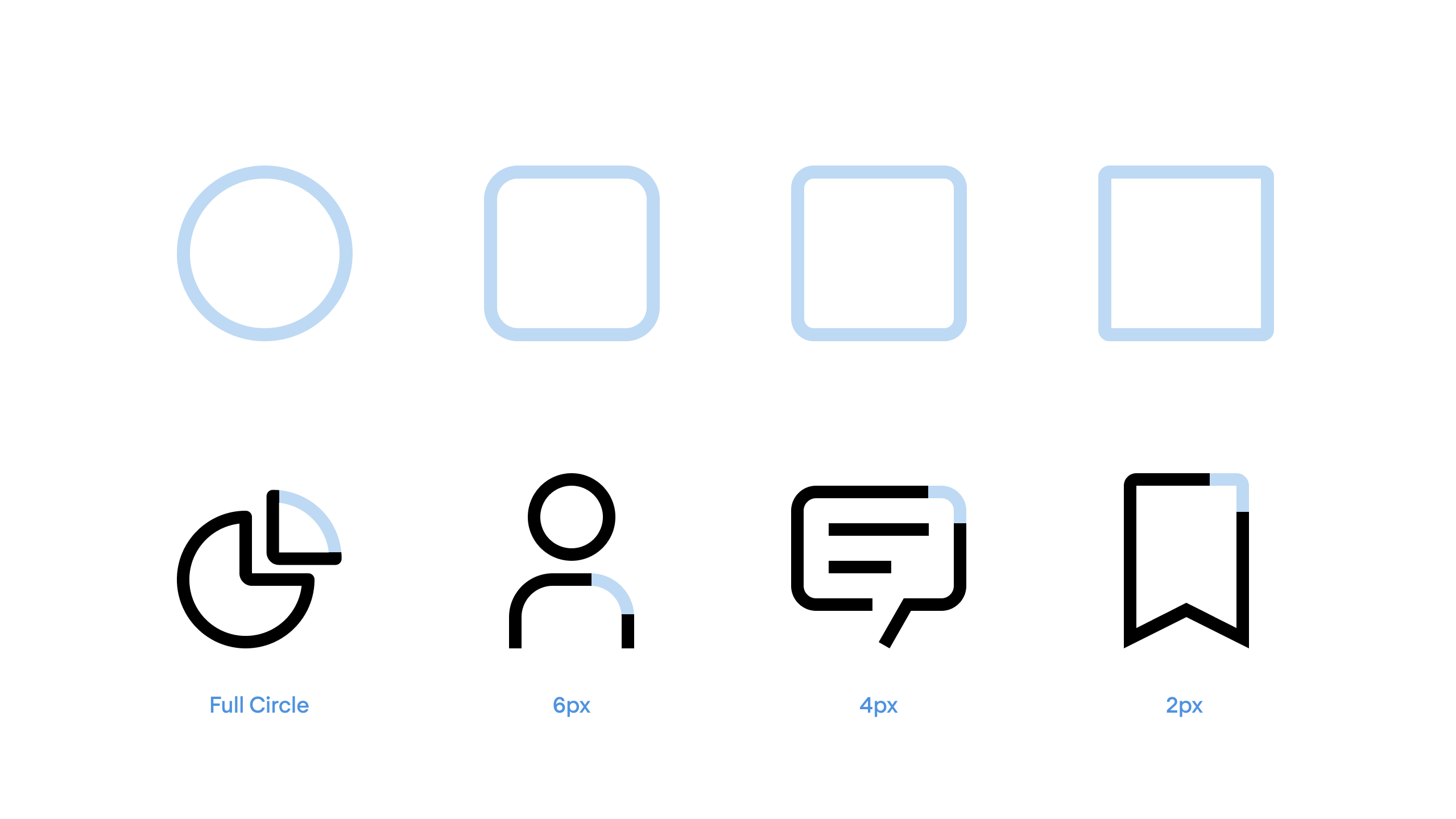 For rounded shapes, stick to a 2px corner radius. If needed, increase it by a multiple of two to ensure the icon’s meaning or object shape is clear. You can also add another radius to make the metaphor match the object’s real form.