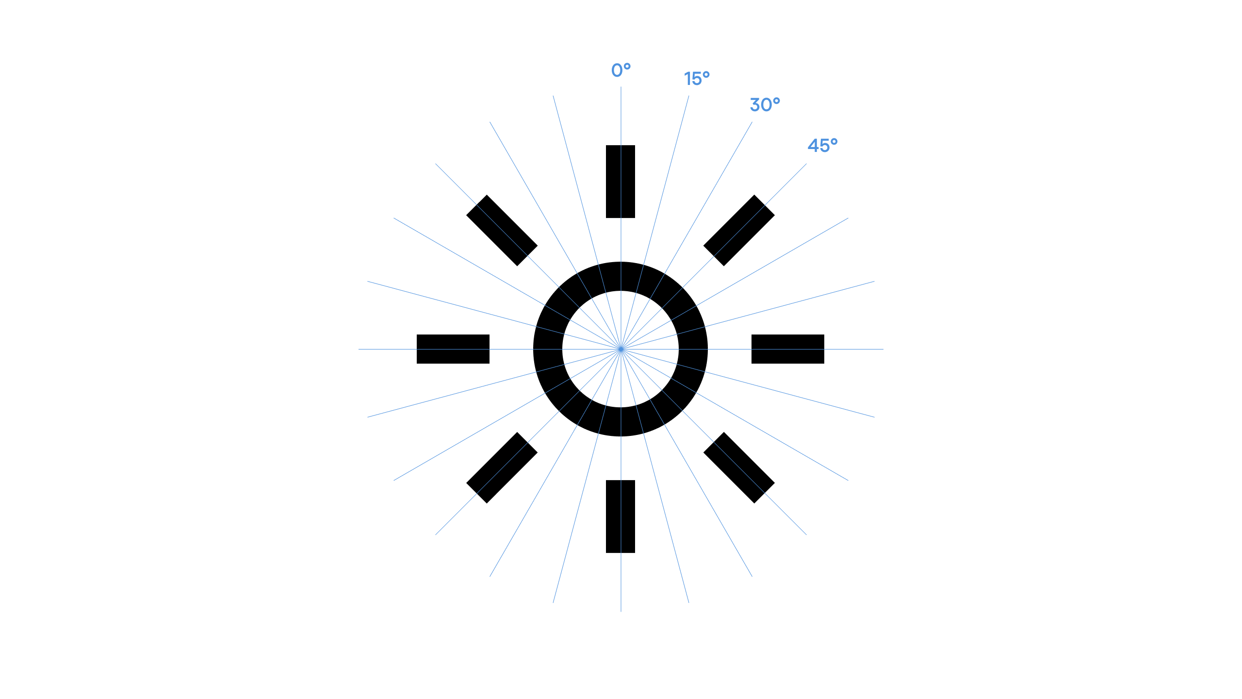 To ensure smooth edges, employ 45° angles for anti-aliasing. When portraying specific shapes in your metaphor, try to use 15° increments whenever feasible. To maintain consistency within the icon set, strive for angles that align with the same increments.