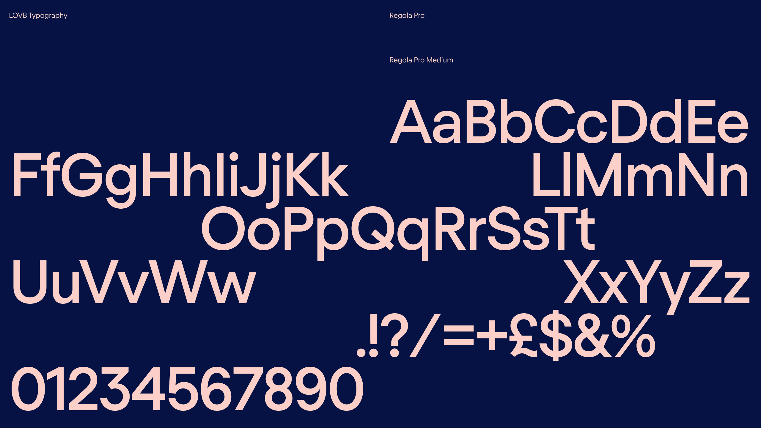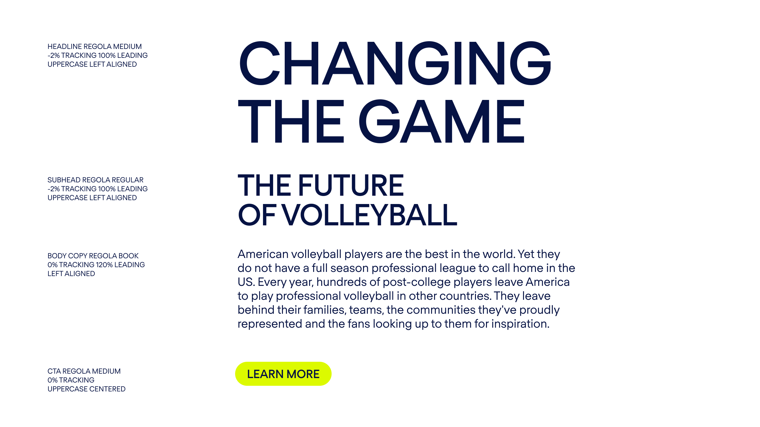 For LOVB, Regola Pro is clear, simple, and impactful. Gentle curves are welcoming and approachable yet the line weight is commanding and purposeful, respectively mirroring LOVB’s tribal spirit and bold ambitions.